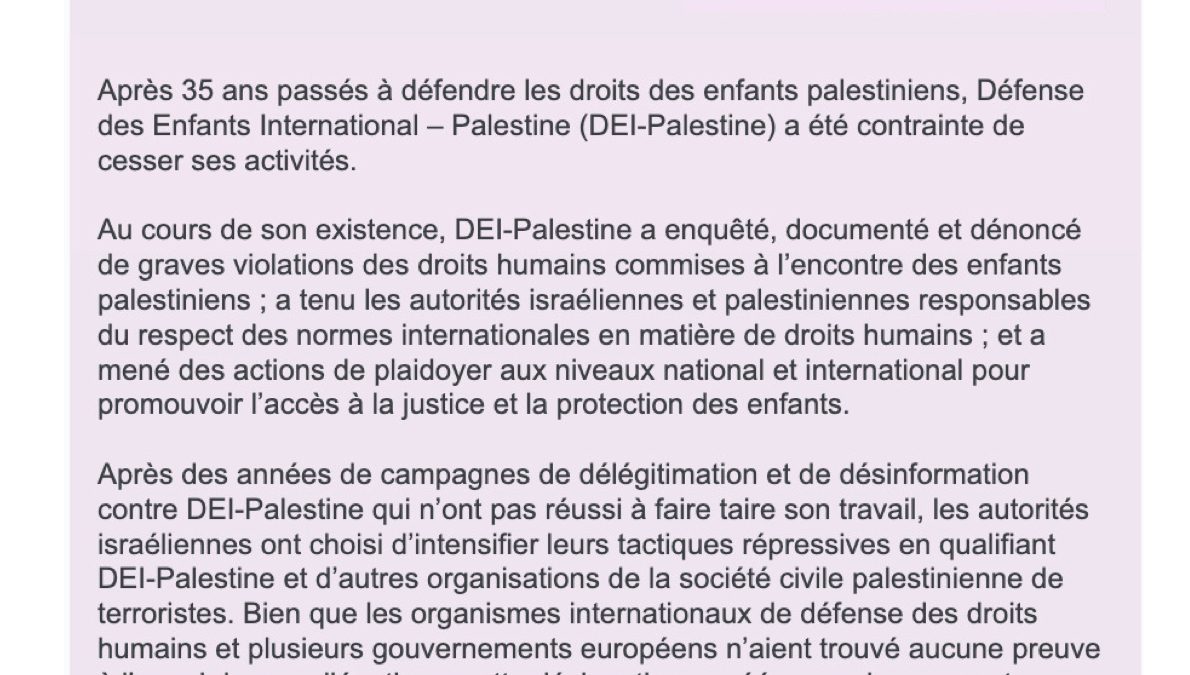 » Nous avons atteint un point où les risques pour les enfants et les familles palestiniens que nous aidons, ainsi que pour les personnes que nous employons, l’emportent sur notre capacité à poursuivre nos activités. C’est le cœur lourd, mais la conscience tranquille, que nous avons décidé de suspendre les activités de DEI-Palestine d’ici la fin mars 2026. »
